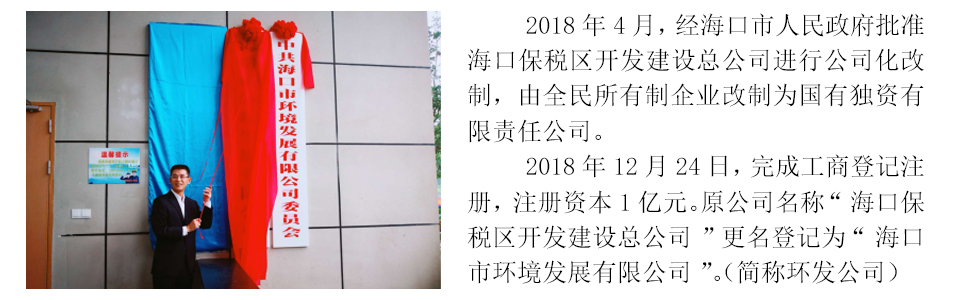 海口市環(huán)境發(fā)展有限公司是海口市屬國有獨資有限責任公司,于2018年12月正式掛牌運營,注冊資本1億元,由1993年12月成立的海口保稅區(qū)開發(fā)建設總公司進行公司化改制而成,核心業(yè)務為環(huán)境環(huán)衛(wèi)產業(yè)投資和運營、資產運營和管理,培育業(yè)務為工程管理